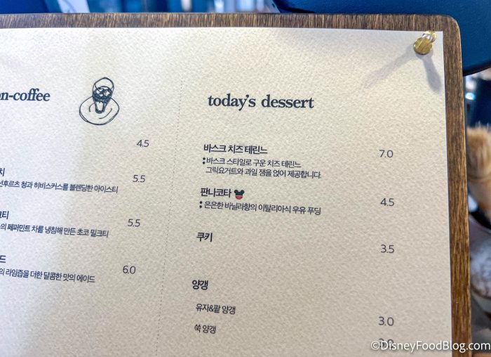 What is this dessert you ask? It’s a Mickey Panna Cotta! It’s described on the menu (roughly translated) as a soft vanilla-flavored Italian milk pudding, and it costs 4500 won. Today that converts to $3.34 U.S. dollars, but that changes daily. Still, a Mickey-shaped snack for under $5? You’ve got our attention!