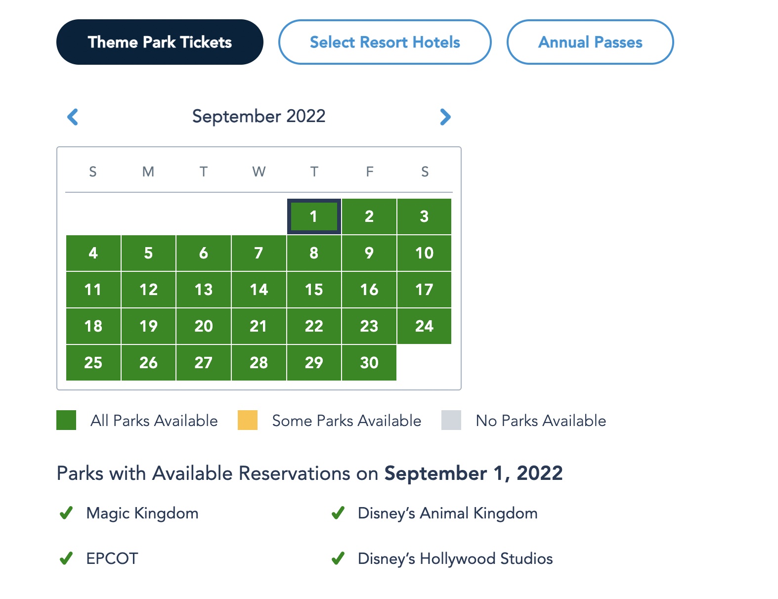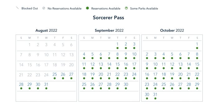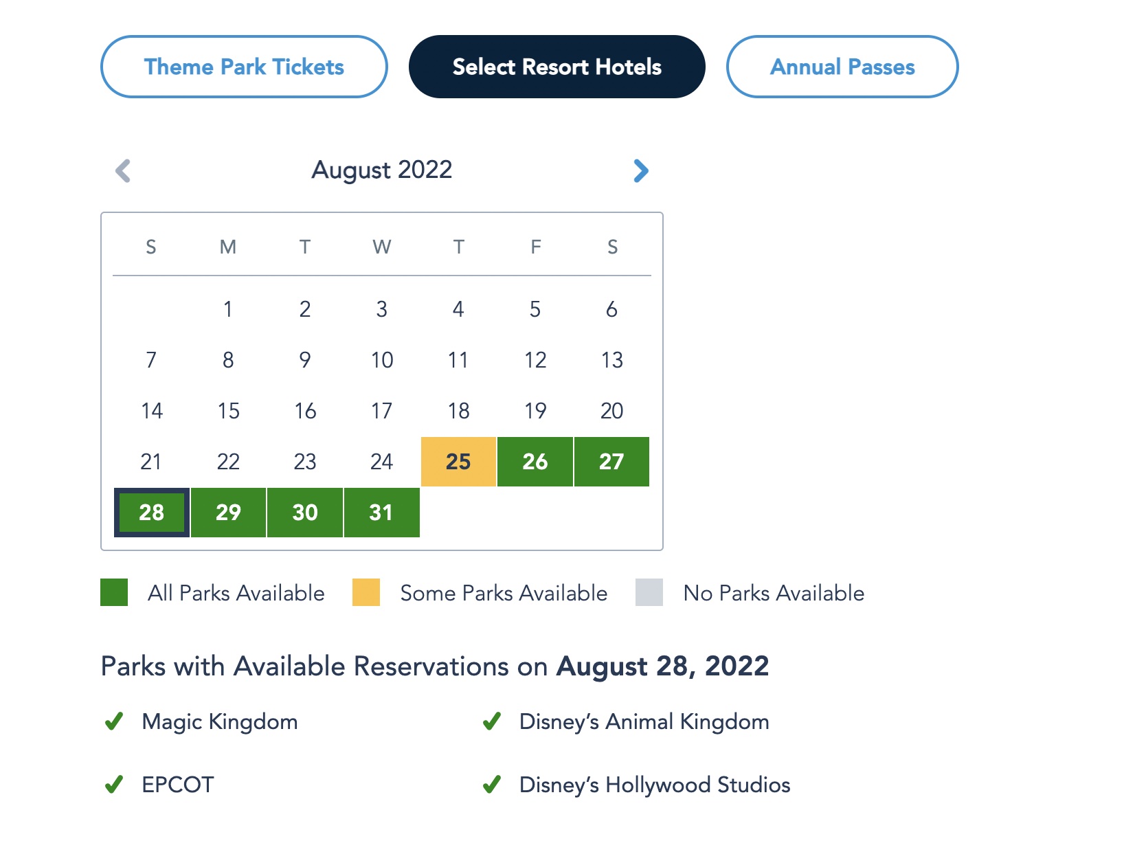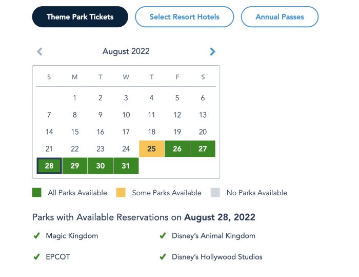 Let’s take a look at Park Pass Reservation Availability for next week! For Theme Park Ticketholders, all parks are completely available from August 18th-31st.