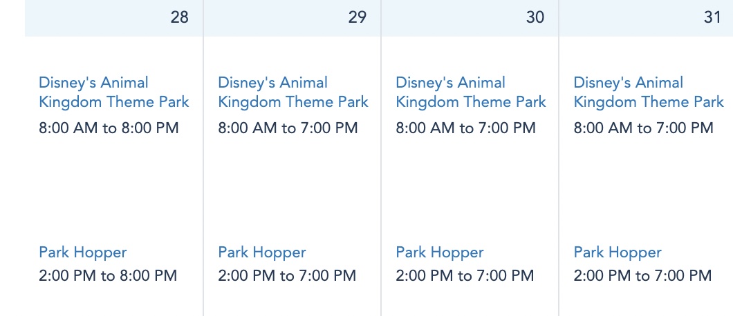 And finally, we come to Disney’s Animal Kingdom. Animal Kingdom is open from 8AM-8PM on August 28th, but from August 29th-31st, it is only open from 8AM-7PM.