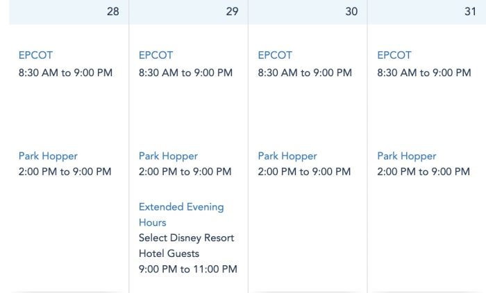 From August 28th to August 31st, EPCOT will be open from 8:30AM-9PM. There will be Extended Evening Hours on August 29th from 9PM-11PM.