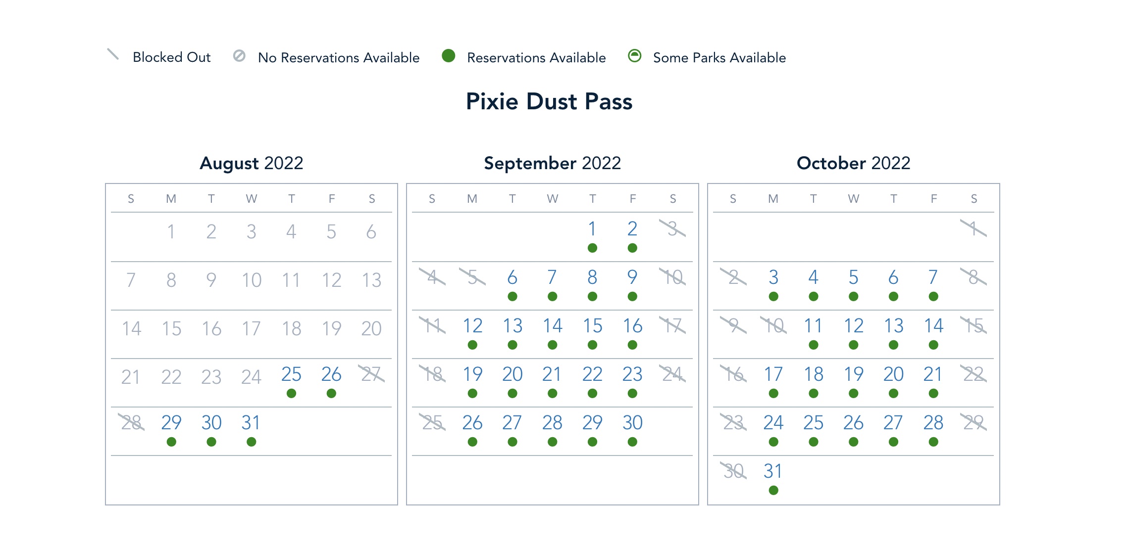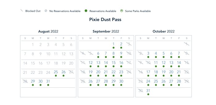And lastly, we have the Pixie Dust Pass! Guests who have the Pixie Dust Pass are blocked out and not able to visit the parks on the weekends, but the weekday availability is wide open next week.