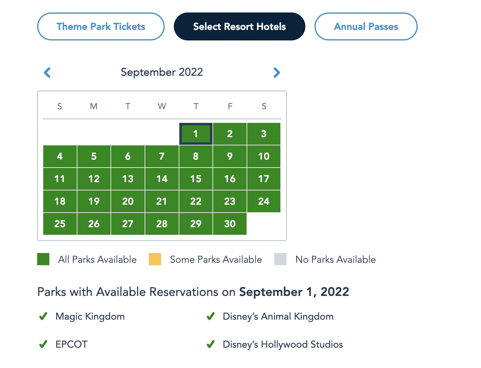 The Park Pass Reservation availability situation looks pretty much the same for Select Resort Hotels, as well. All parks are available at the beginning of next week…