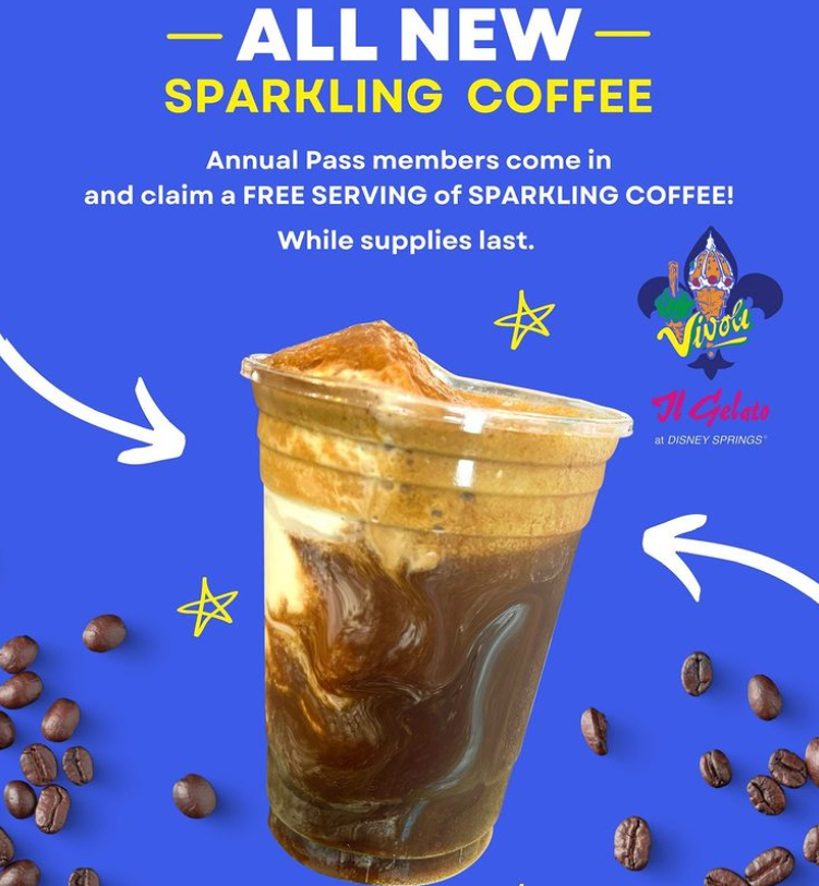 Vivoli il Gelato in Disney Springs has just introduced its Sparkling Coffee. It’s basically a refreshing cold fizzy coffee drink. For a limited time, Annual Passholders can get a Sparkling Coffee FOR FREE!