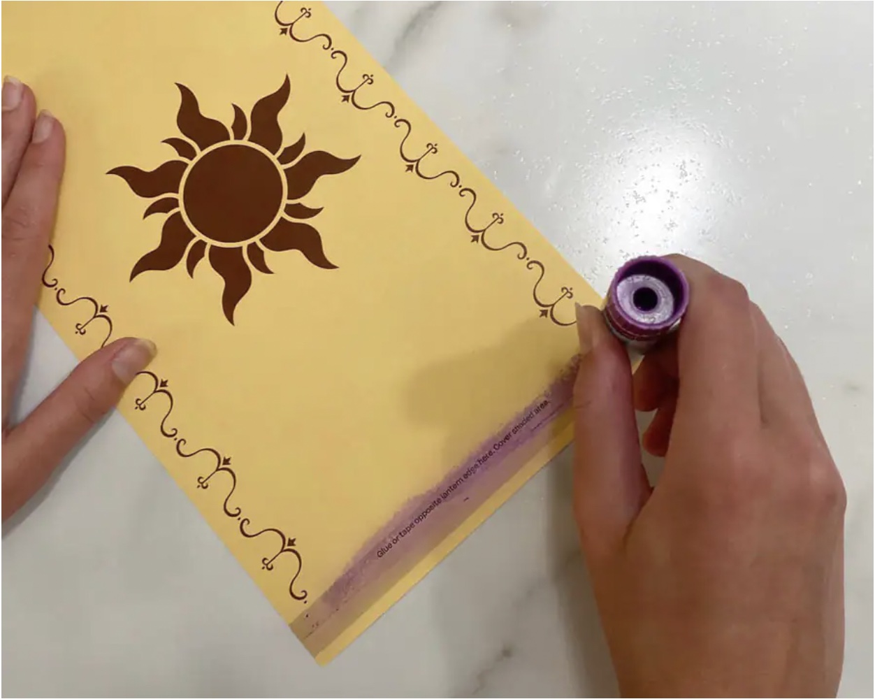 Then it’s time to make the lantern! Using glue or tape, you’re going to adhere the edges of the lantern together, covering the shaded area.