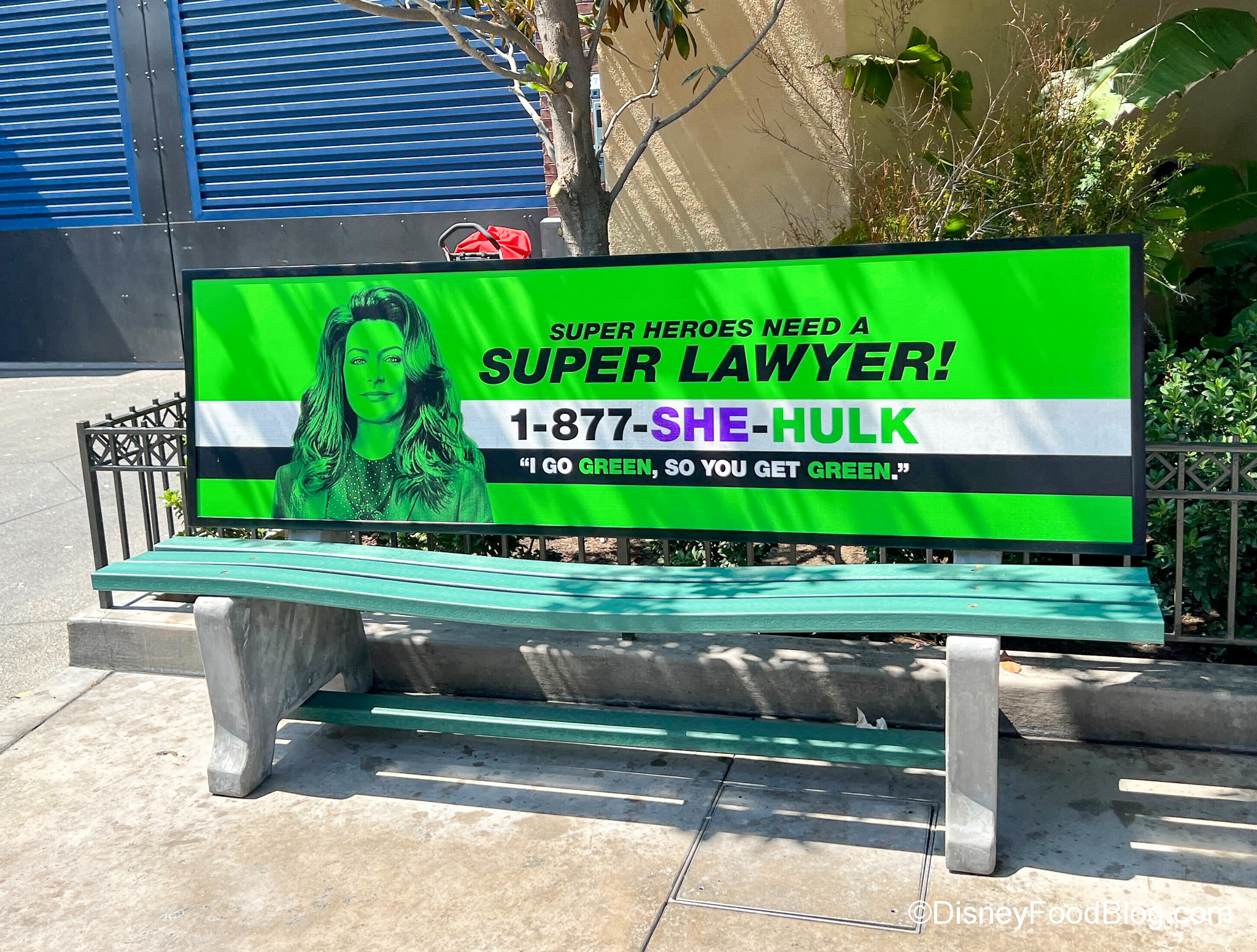 There’s a new addition to Avengers Campus — a bench with a She-Hulk ad on it is now here!