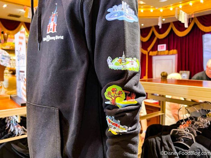 The last piece of clothing is this black hoodie, which has a Disney World logo on the front…