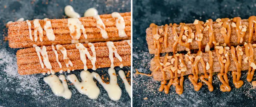 - Spooky Churro: A delicious churro rolled in cinnamon sugar, drizzled with peanut butter and chocolate sauce, and topped with peanut butter candy pieces
