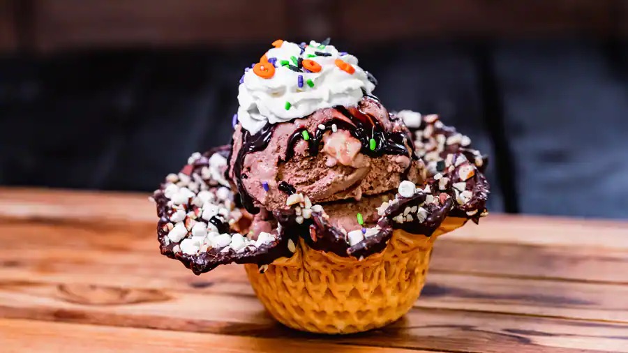 - Rocky Road Halloween Sundae: Rocky road waffle bowl, rocky road ice cream, marshmallow cream, hot fudge, and whipped cream topped with sprinkles (New)
