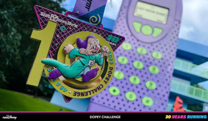 And if you’re ambitious enough to run all 4 races to complete the Dopey Challenge, you’ll receive the Dopey Medal which is shaped like a 10 to celebrate the 10 years the challenge has been running (pun intended). It also says 48.6 to honor the miles run by participants in this challenge.