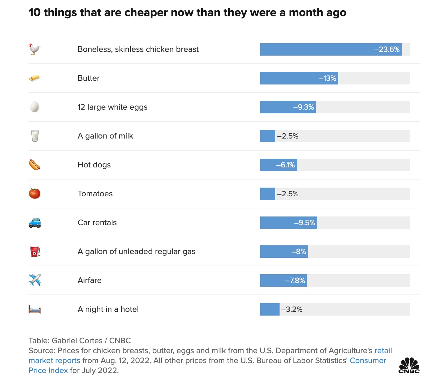 Travel-related expenses like rental cars, gas, hotel rooms, and airfare all saw price decreases in July, according to CNBC. As of August 29th, AAA is reporting that the national average price for gas is $3.85, down from the national average one month ago, which was $4.25. Car rentals have seen a decrease in price of 9.5%, while airfare has decreased by 7.8%, and one night in a hotel has decreased in price by 3.2%.