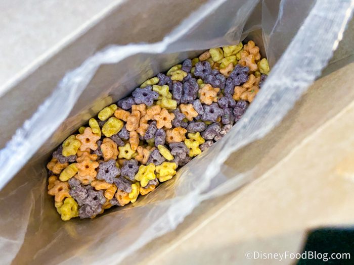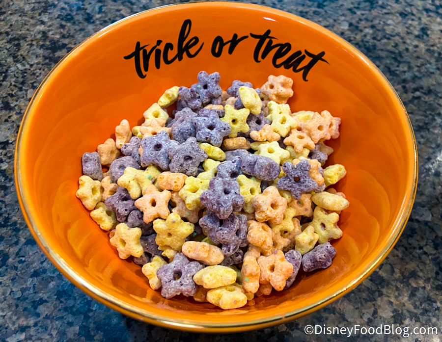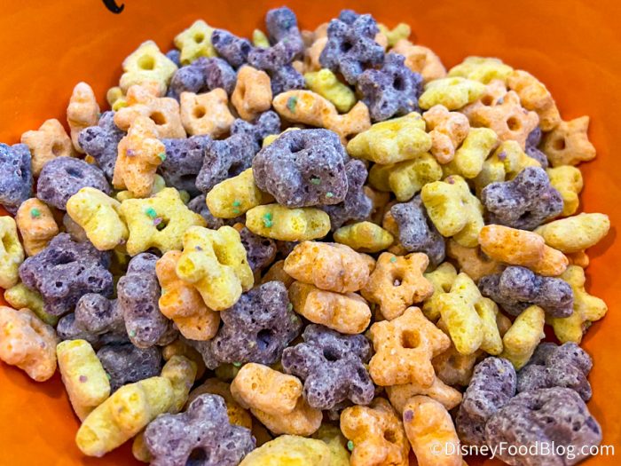 The cereal is shaped like little stars and appear to have somewhat of a frosted coating. It’s also in the colors of the Sanderson Sisters’ hair — Orange, Purple, and Yellow.