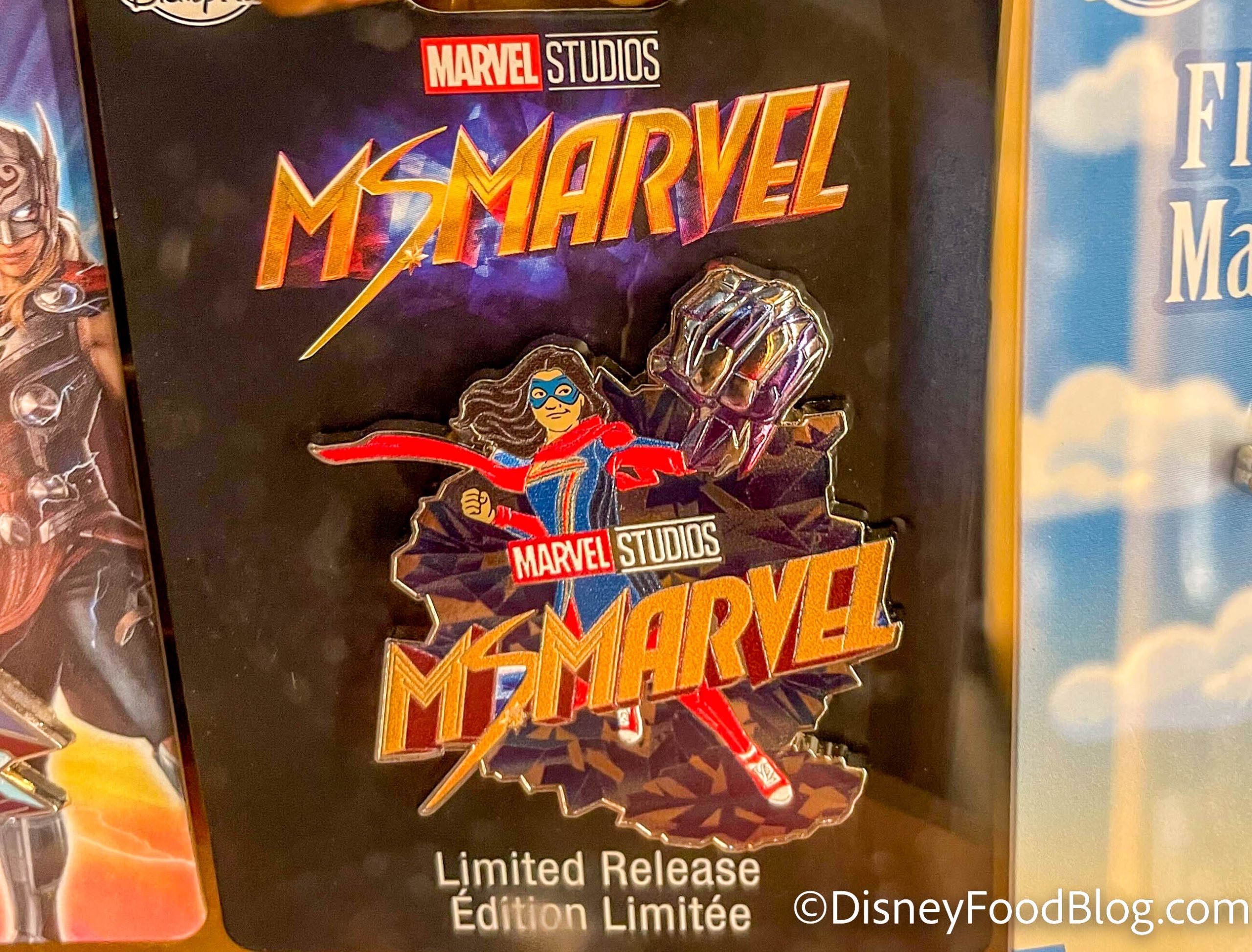 In the display case for the “fancy” pins, we spotted this Ms. Marvel design! It’s a limited edition and has the hero with her logo plastered in front.