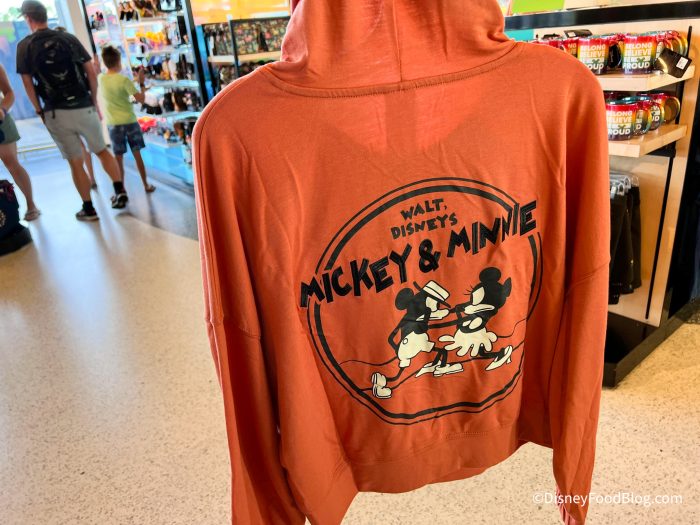 This sweatshirt has Mickey and Minnie in an older-looking animation style, and on the back, it says “Walt Disney’s Mickey & Minnie.”