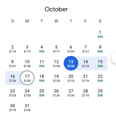We also restrict our search to flight costs for a limited number of days in the month. We usually look for a flight that leaves on a Thursday and returns on a Monday. For this trip, we looked at a trip that departed on October 13th and returned on October 17th. When we looked at the various Thursday-Monday trips in October, this had neither the most expensive nor the least expensive starting round trip price. It also avoided the Halloween holiday, so you could be at home with plenty of time to trick-or-treat!