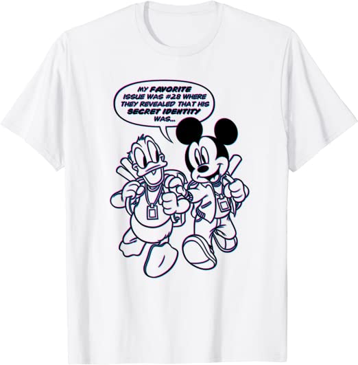 If you’re all about getting the secrets, then you can check out this sweet shirt with Mickey and Donald where Mickey is talking about a comic issue where someone’s secret identity was revealed!