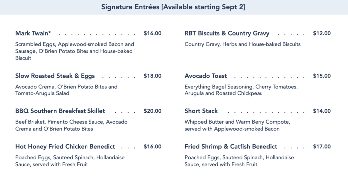 The signature entrées include the Mark Twain made with scrambled eggs, applewood-smoked bacon and sausage, O’Brien potato bites and house-baked biscuit, and the Hot Honey Fried Chicken Benedict made with poached eggs, sauteed spinach, Hollandaise sauce, and fresh fruit.