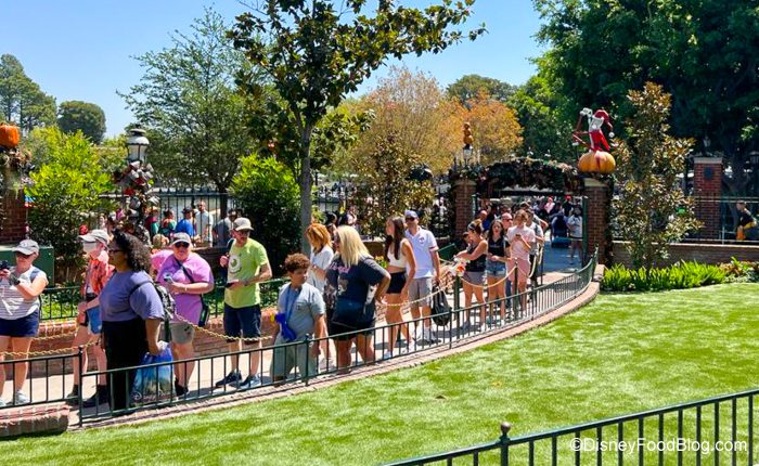 We get it — it’s always exciting when the Haunted Mansion reopens with its Halloween and holidays theme of Nightmare Before Christmas. We love it when Jack Skellington and his friends take over the mansion of 999 happy haunts! But apparently everyone else loves it, too, because LOOK AT THIS LINE.