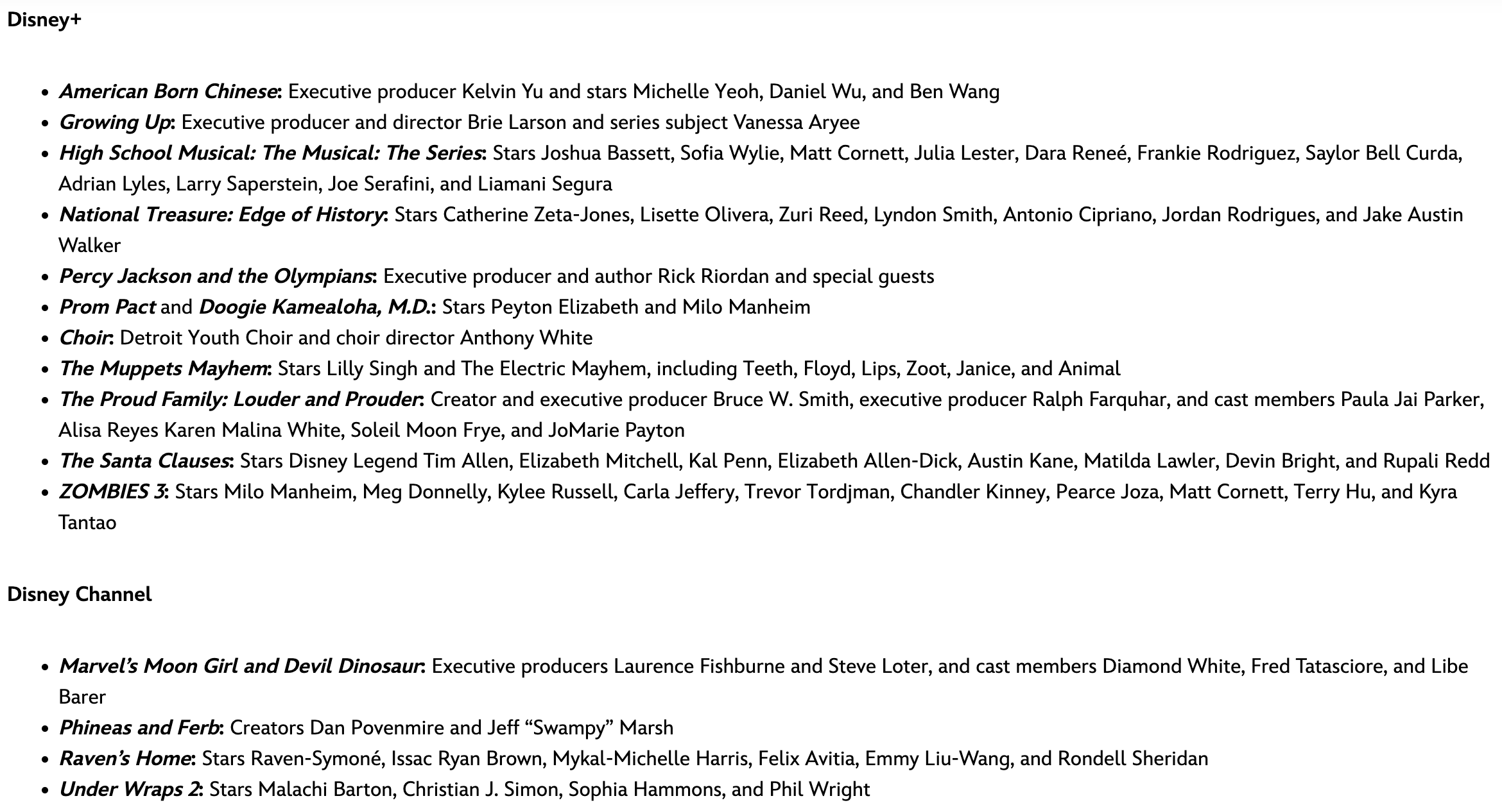 Cast and members of the creative teams from multiple popular Disney movies and shows will be in attendance, including casts from the series Hamster & Gretel, Marvel’s Moon Girl and Devil Dinosaur, The Santa Clauses, and The Proud Family: Louder and Prouder.