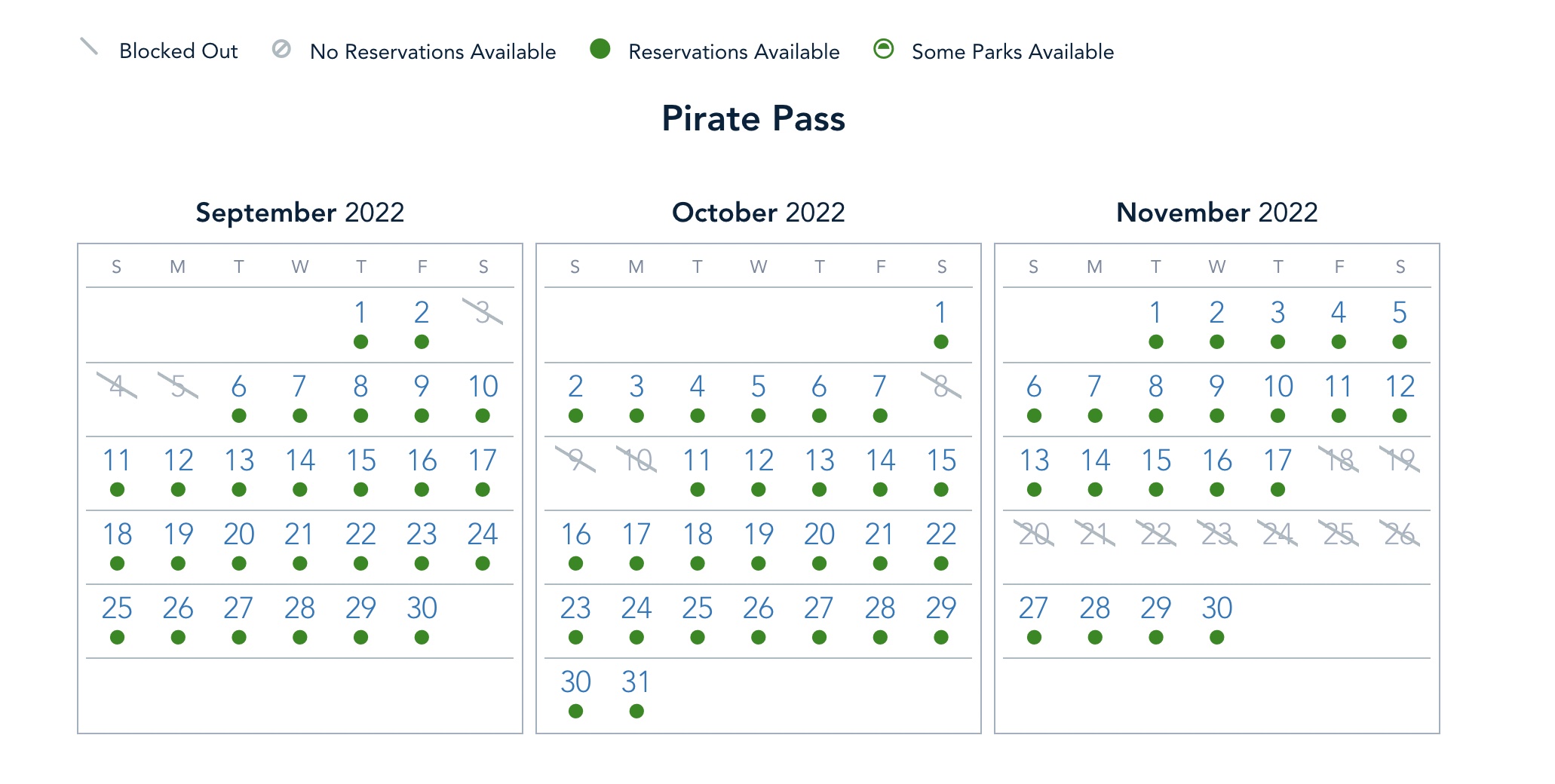 Guests who have the Pirate Pass are blocked out on September 4th and 5th due to Labor Day, but have open Park Pass availability for the rest of the week.