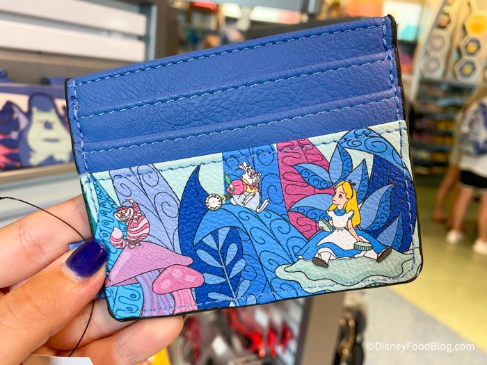 It’s blue and has characters from the movie like the White Rabbit, Cheshire Cat, and Alice herself. This wallet is $16.99.