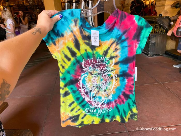 And our final new merchandise item comes from Plaza Del Sol, the gift shop at the end of the Pirates of the Caribbean ride. We spotted this Tie-Dye Coco shirt — because apparently, Disney is really leaning into this whole tie-dye thing.