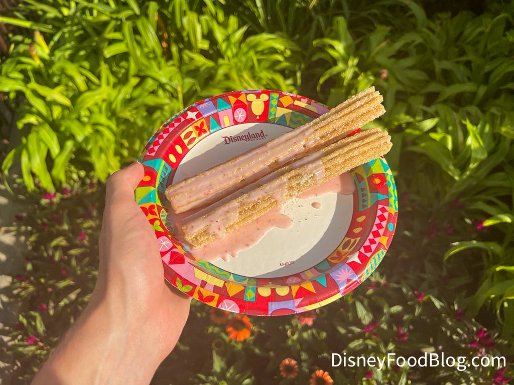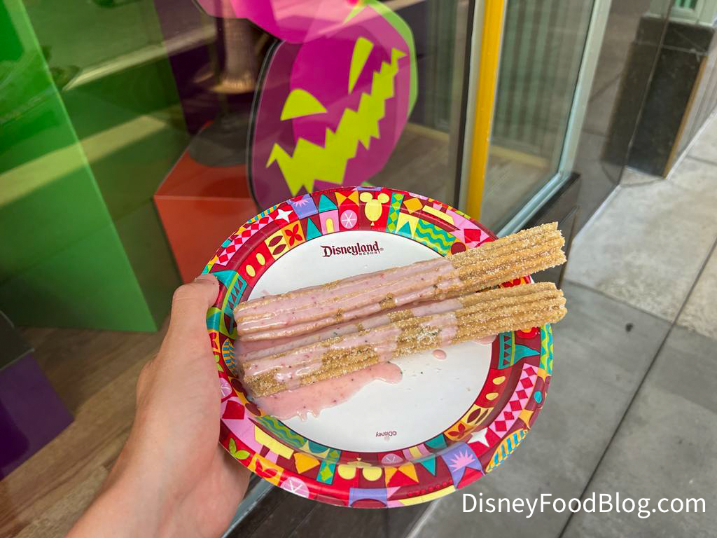 This is the NEW Sour Candy Churro from the Hollywood Churro Cart in Disney California Adventure park! It’s a sour sugar-dusted churro topped with sweet watermelon icing for $6.75. So, does this taste like the Halloween sour candy of our dreams or nightmares? Let’s find out!