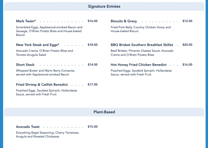 The menu then details this spot’s signature entrees. There are some returning items like the Mark Twain. The menu also includes things like New York Steak and Eggs, Hot Honey Fried Chicken Benedict, and Fried Shrimp & Catfish Benedict.