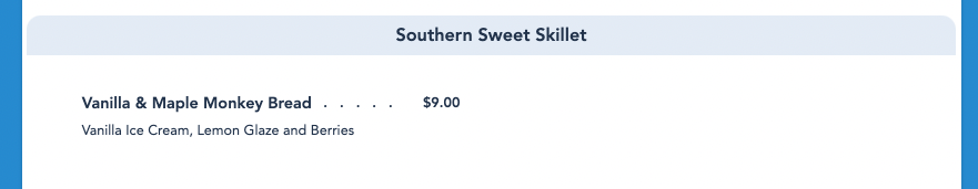 In terms of entrees, adults can also opt for this spot’s Southern Sweet Skillet — the Vanilla and Maple Monkey Bread. We’ve seen monkey bread served here before, though this specific one has vanilla ice cream, lemon glaze, and berries.
