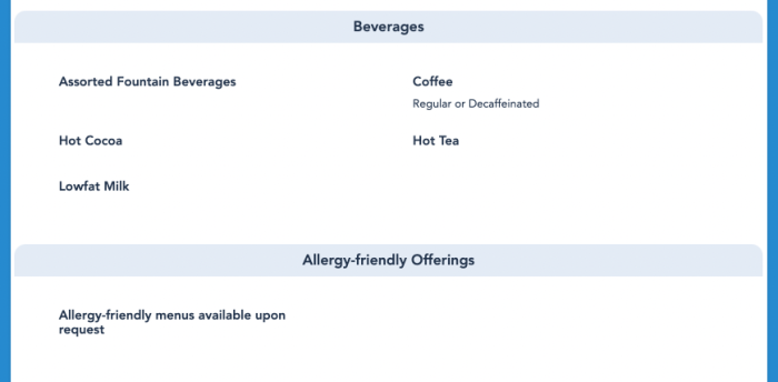 Finally, you’ll also see some beverages listed on the menu, and a reminder to ask for allergy-friendly menus when needed.