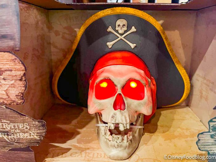If you push a button on the back of the skull, its eyes will glow red and the pirate will say some phrases inspired by the Pirates of the Caribbean attraction.