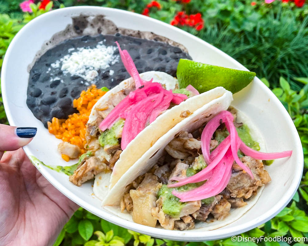 - Pork Tacos: Pork carnitas on flour tortillas topped with avocado salsa verde and pickled onions served with Mexican rice and black beans topped with queso fresco