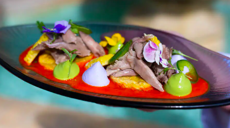 - Un Poco Loco Tostones: Green plantains, duck confit, roasted pepper purée, avocado mousse, charred corn, and cotija cheese foam (New)