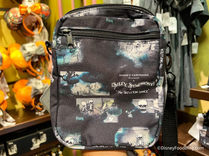 This bag is a small crossbody with images from “The Skeleton Dance” on it. You can grab it at Discovery Trading Company or online for $29.99.