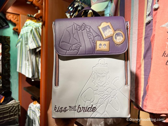 We’ve seen this backpack at Disneyland, and it has The Bride from the Haunted Mansion on it with images of her beheaded husbands. You can grab this bag online, as well. It is $49.99.