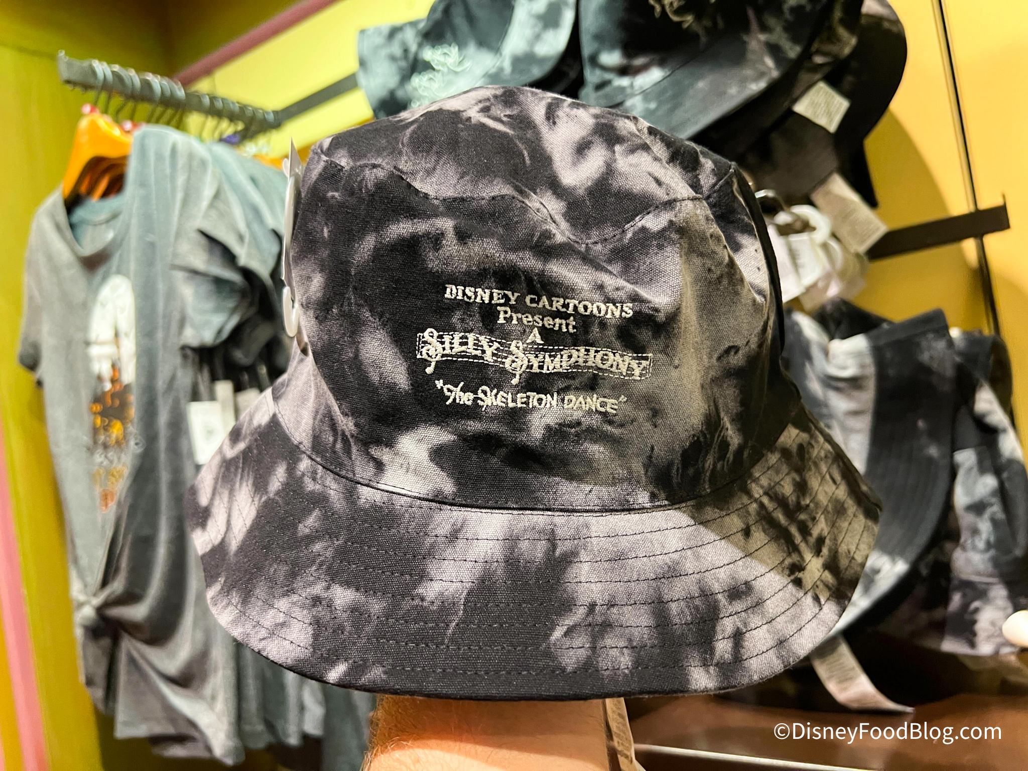 At Discovery Trading Company, we saw tons of Halloween merch, including a bunch of stuff from the Skeleton Dance line of items. For example, we saw the Skeleton Dance Bucket Hat. The hat is black and white tie-dye and has four skeletons embroidered on it.
