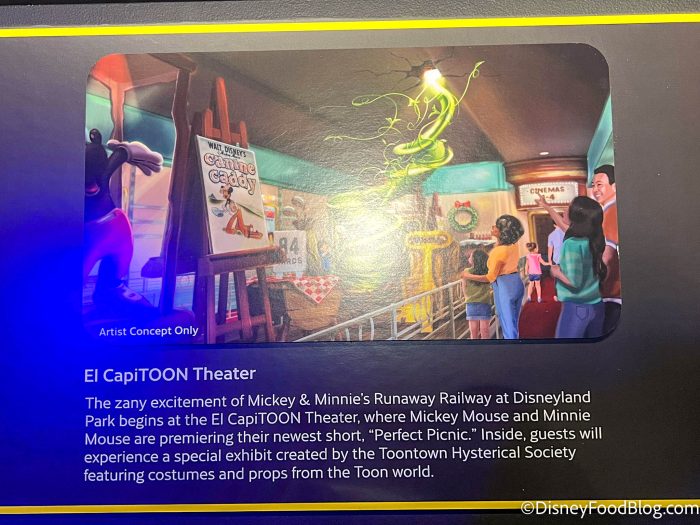 And the opening of Mickey & Minnie’s Runaway Railway will take place at the El CapiTOON Theater, where the “Perfect Picnic” short will be shown to riders. There will also be a special exhibit “created by the Toontown Hysterical Society” that showcases life in the Toon world.