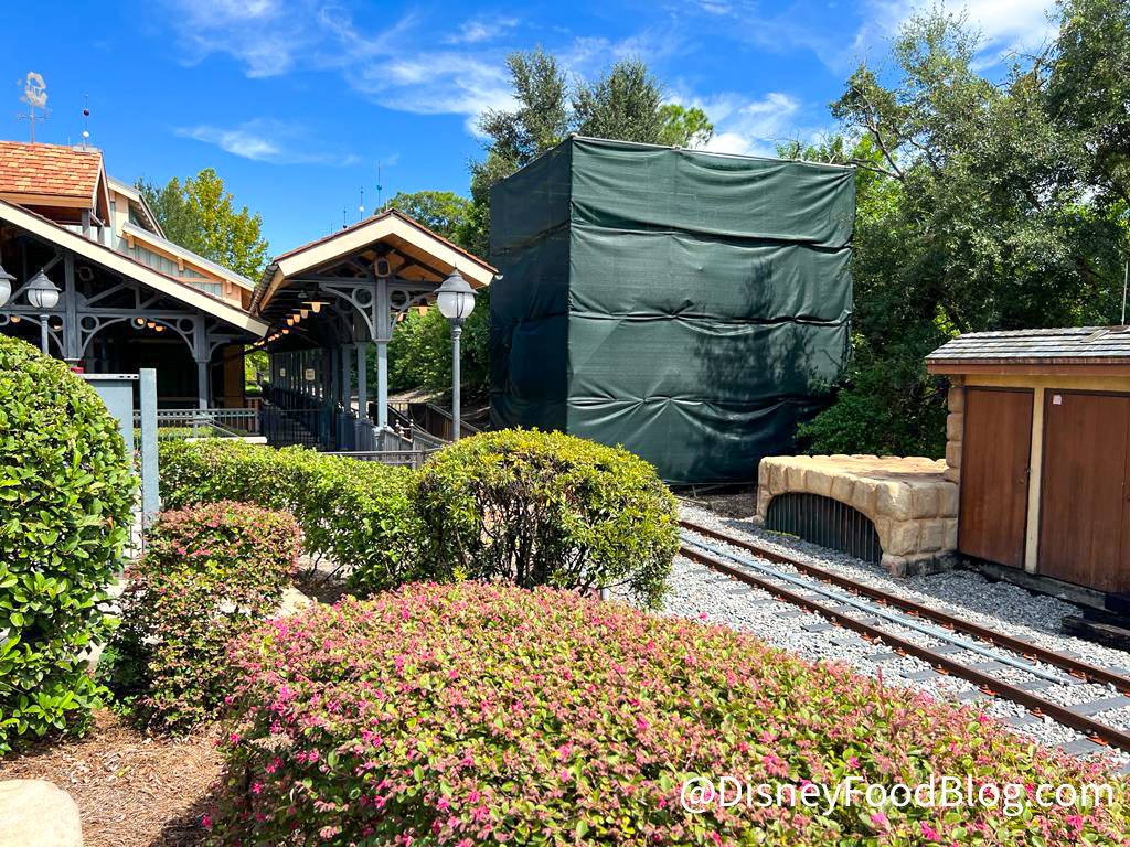 Construction is chuggin’ along over at the Walt Disney World Railroad, which has now been closed for over three years. We recently saw some scaffolding covered in green scrim near the Fantasyland Station.