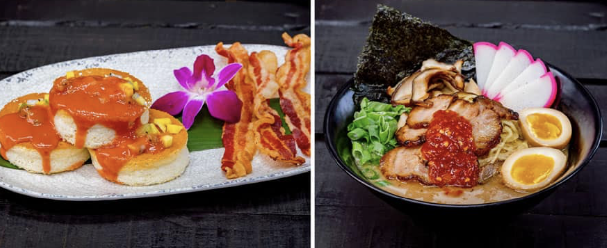 - Thick & Fluffy Japanese Pancakes — topped with a tropical fruit blend made up of starfruit and guava syrup and served with bacon (new)