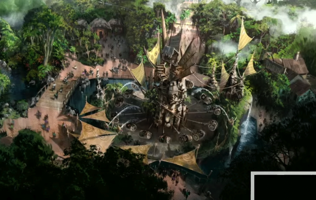 Starting at the bottom left, you can see a path around a big lake/water area. It looks like there is a platform leading potentially from the walkway toward the giant sail with Moana’s symbol on it. It looks like what you’re walking to is meant to be a sort-of giant boat (you can see the bottom of the boat below that platform). This could be the loading or unloading area for a boat ride perhaps. It looks like there is a boat coming in to potentially unload guests near the platform, and another boat heading off (likely at the start of the ride) toward a break in the waterfall in the distance.
