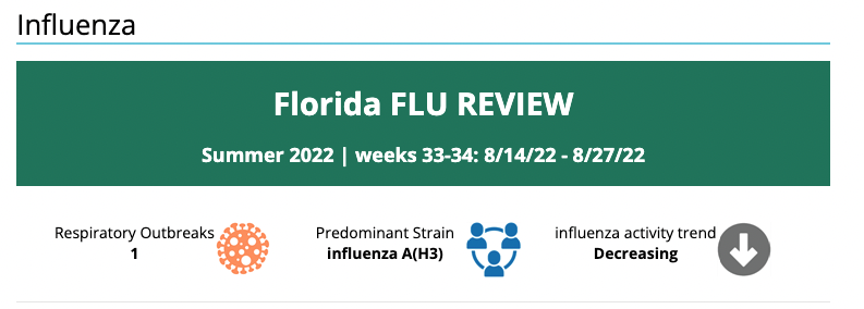 Want to know what the flu numbers are looking like in Florida ahead of your trip? Head to the Florida Health website to see their updates. For the weeks encompassing August 14th-August 27th, 2022, Florida’s numbers showed a decreasing activity trend when it comes to the flu.