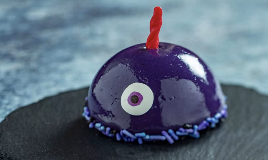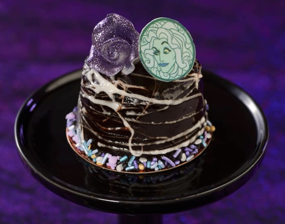 - Madame Leota Dark Chocolate Cake: Devil’s Food mini cake filled with dark chocolate ganache topped with chocolate glaze and marshmallow webs (New)