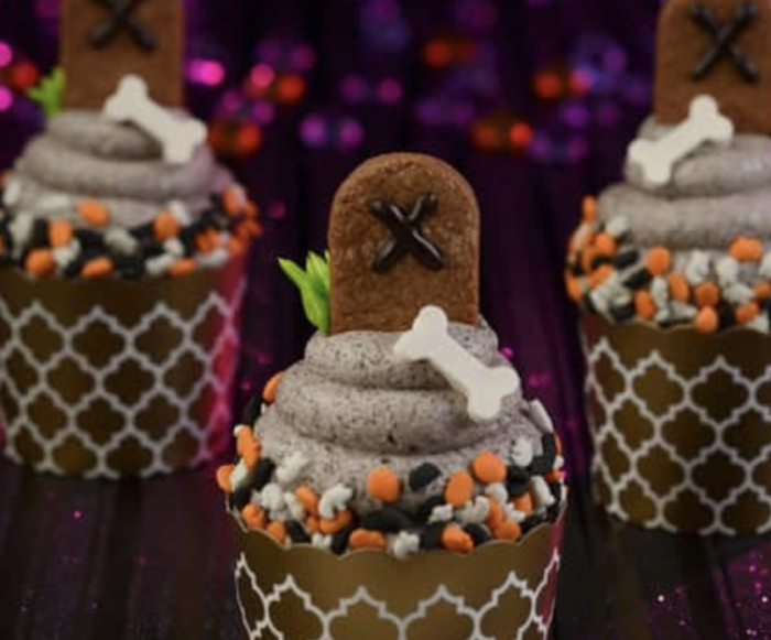 - Graveyard Cupcake: Fudge-filled Chocolate cupcake topped with cookies and cream buttercream, chocolate cookie tombstone, white chocolate bone, and Halloween sprinkles