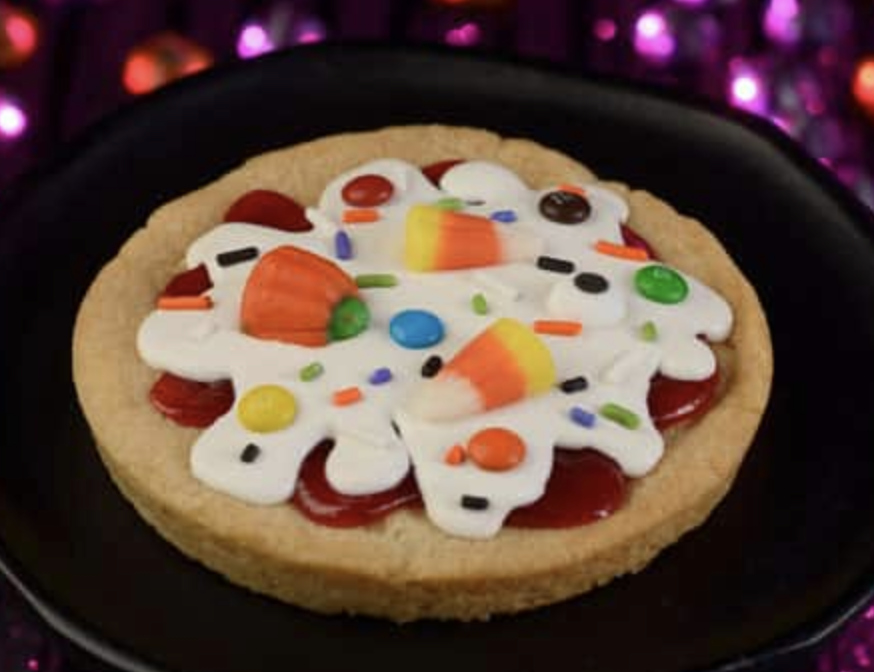 - Halloween Candy Cookie Pizza: Sugar cookie “pizza” topped with strawberry jam, white chocolate, Halloween candy, and sprinkles (New)