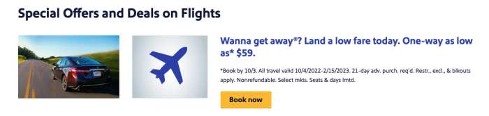 Southwest has introduced a special deal where you could get your next one-way flight for as low as $59! To take advantage of this deal, you’ll need to book your flight by October 3rd at 11:59PM Central Time. The ticket you buy can be for travel from October 4th, 2022, through February 15th, 2023.