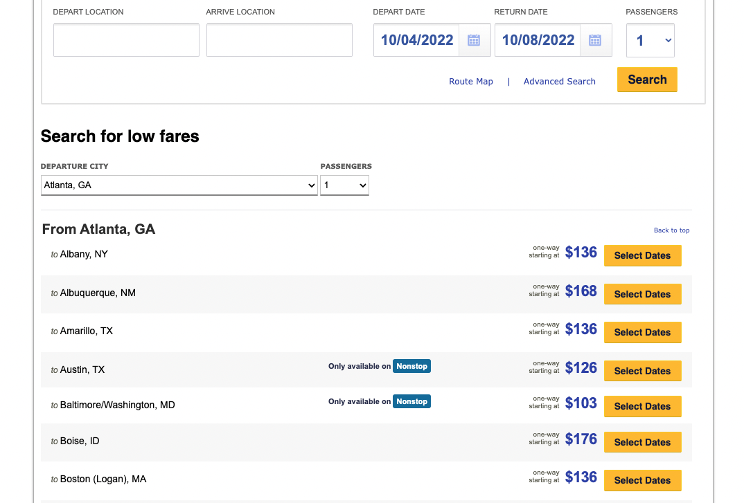 When we searched for that same period of time from San Antonio, TX, no discounted flights (under this deal) popped up for Orlando, but they were available for other cities. We also found some trips where a one-way discount was available to Orlando, but tickets were closer to $100-$130. So it can all depend on the days you search or the location you’ll be flying from.
