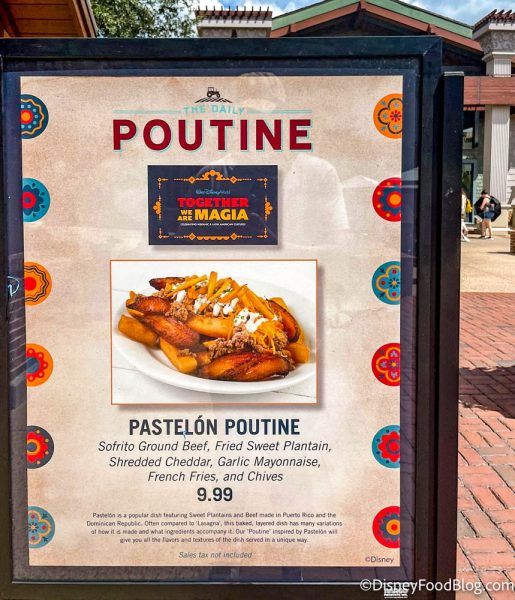 Disney Springs is a GREAT place to enjoy shopping, entertainment, and of course — FOOD! We’re heading on over to the Daily Poutine located in the Town Center area of Disney Springs to try the NEW Poutine de Pastelón for $9.99.