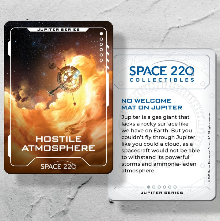 Each detail on the collectible cards from Space 220 has a special meaning — every series of cards are named after a planet with six cards in each series. Each series also includes a rare Tech-Specs card that is stamped with blue foil ink and gives details about current and future space technology.