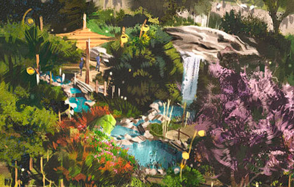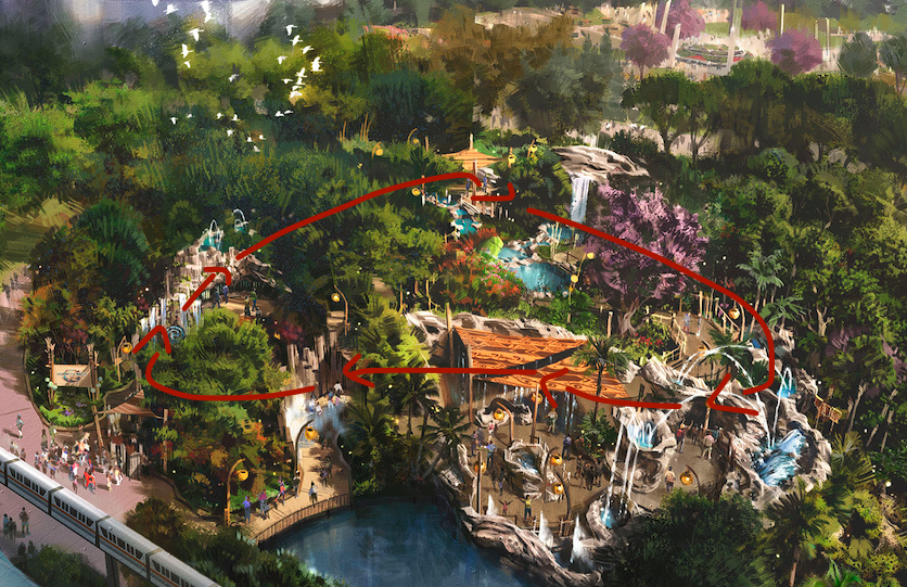 Things could look very different once they’re finalized and actually inside the park. So take everything here with a grain of salt because some of the foliage, structures, etc. in this concept art might be totally different or not even there when we get to the final version of this attraction!