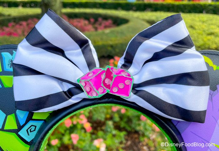 The bow is black and white stripes, just like Jack Skellington’s suit — and there’s a pair of dice in the center!