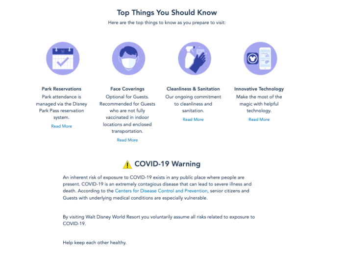 You can, however, still find information about health and safety requirements (including a warning about COVID-19) on Disney World’s page about reopenings and recent changes that are related to the pandemic.